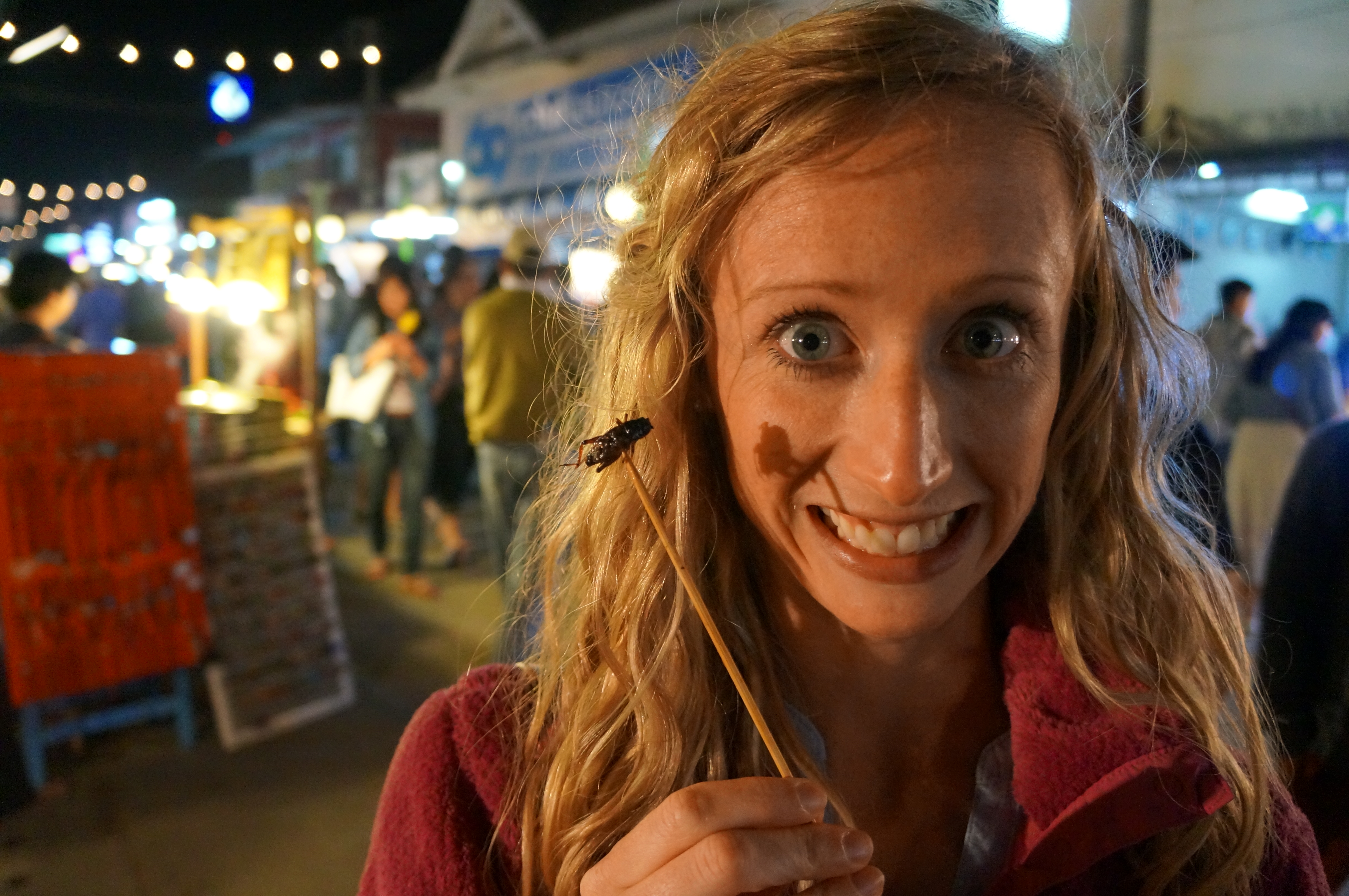 Getting Sick from Eating Insects: It’s a rite of passage here in Southeast Asia to consume a fried insect or at least that seems to be the case. We passed several street vendors with a large array of fried insects who were displaying them as if they were a delicacy. Seeing as that we had been traveling in Thailand for over two weeks we decided it was time to bite the bullet and do it.  Knowing full well that it wasn’t going to be pretty, we bee lined it to the nearest Seven Eleven store to purchase a chaser.  Brian was feeling far braver than I was that night and went for the mac daddy of the insects.  I, on the other hand,  opted for the smallest of the bunch.  Here is the proof that it did, in fact, happen!