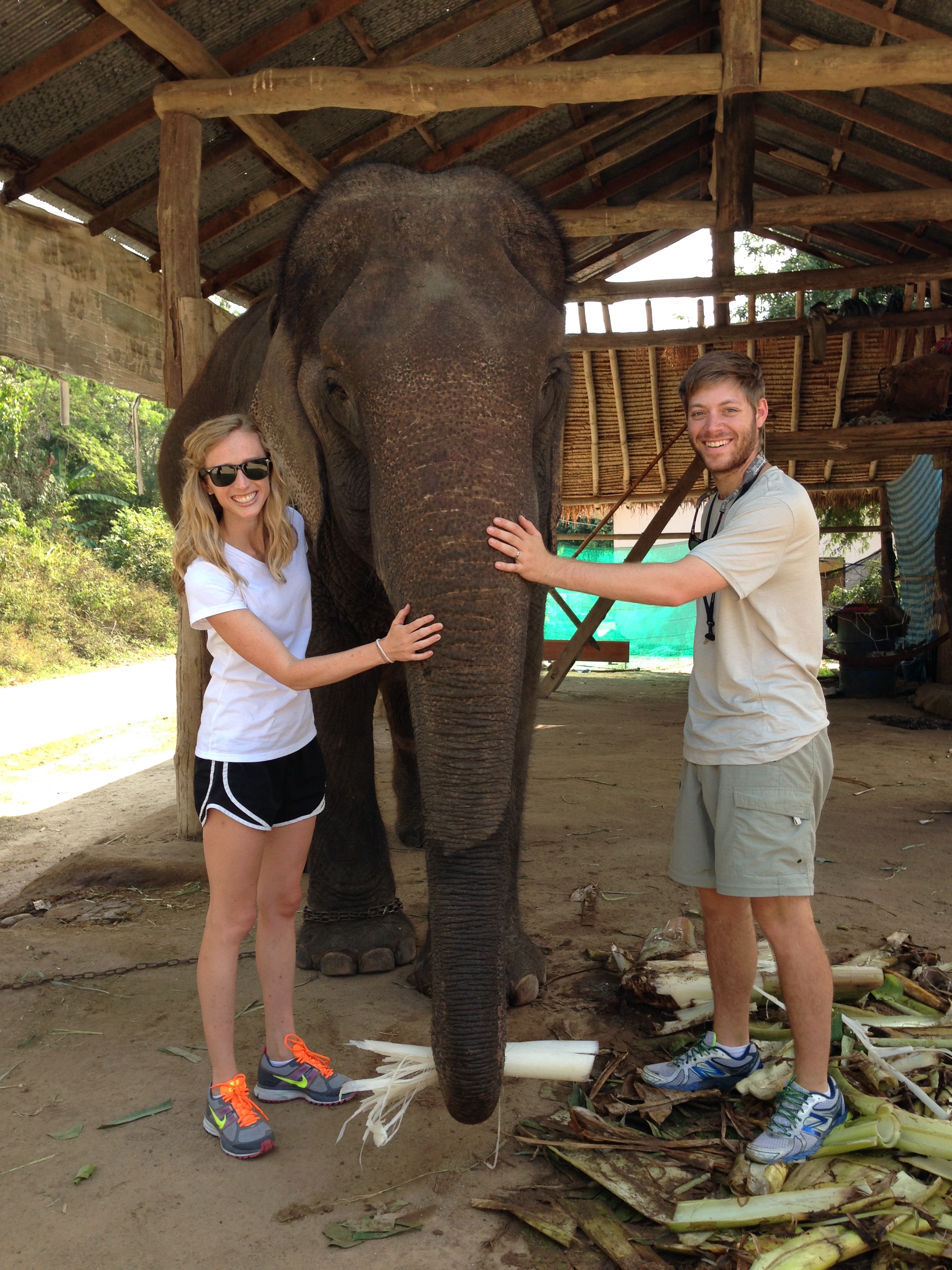 Our elephant, Noi, enjoying a banana tree for lunch.